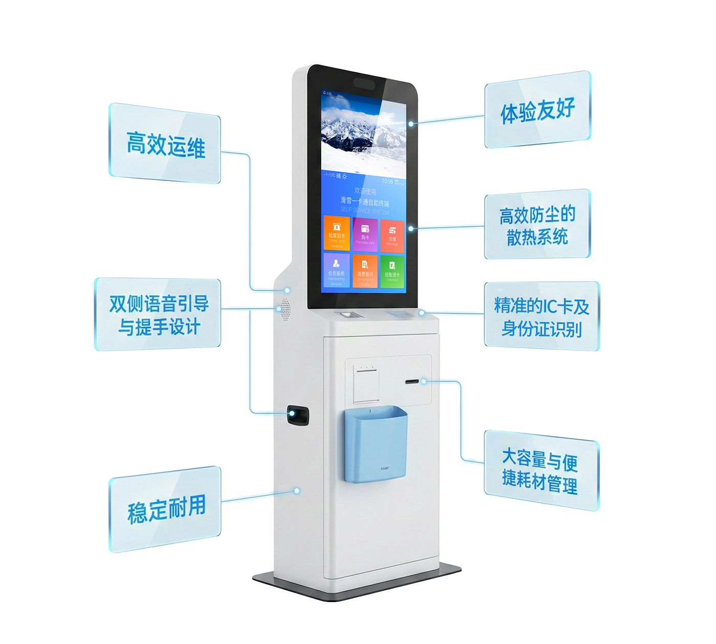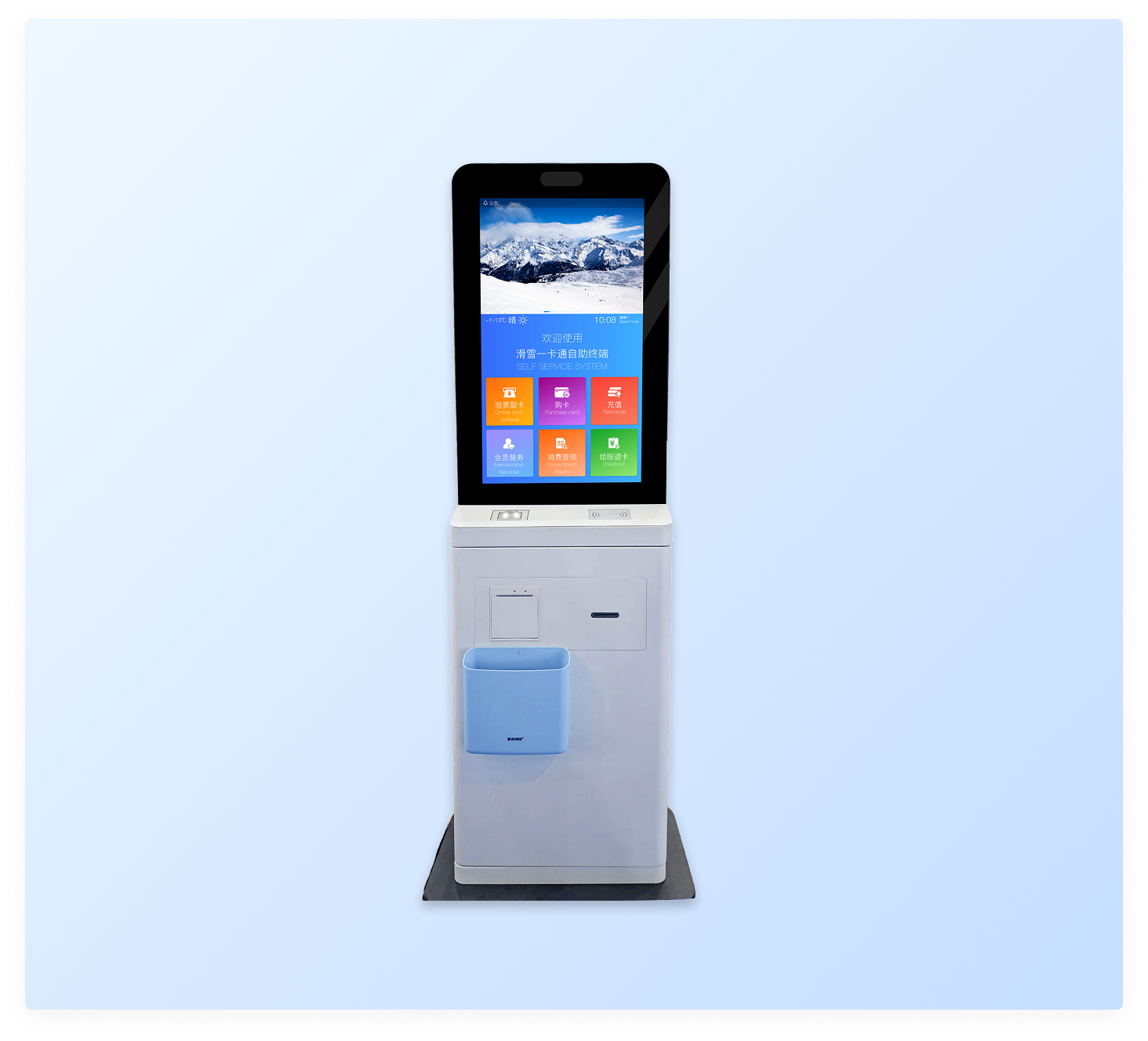 自助终端专为滑雪场低温环境设计,关键部件可在-25℃至-30℃的低温下稳定运行,确保严寒天气下的正常使用。