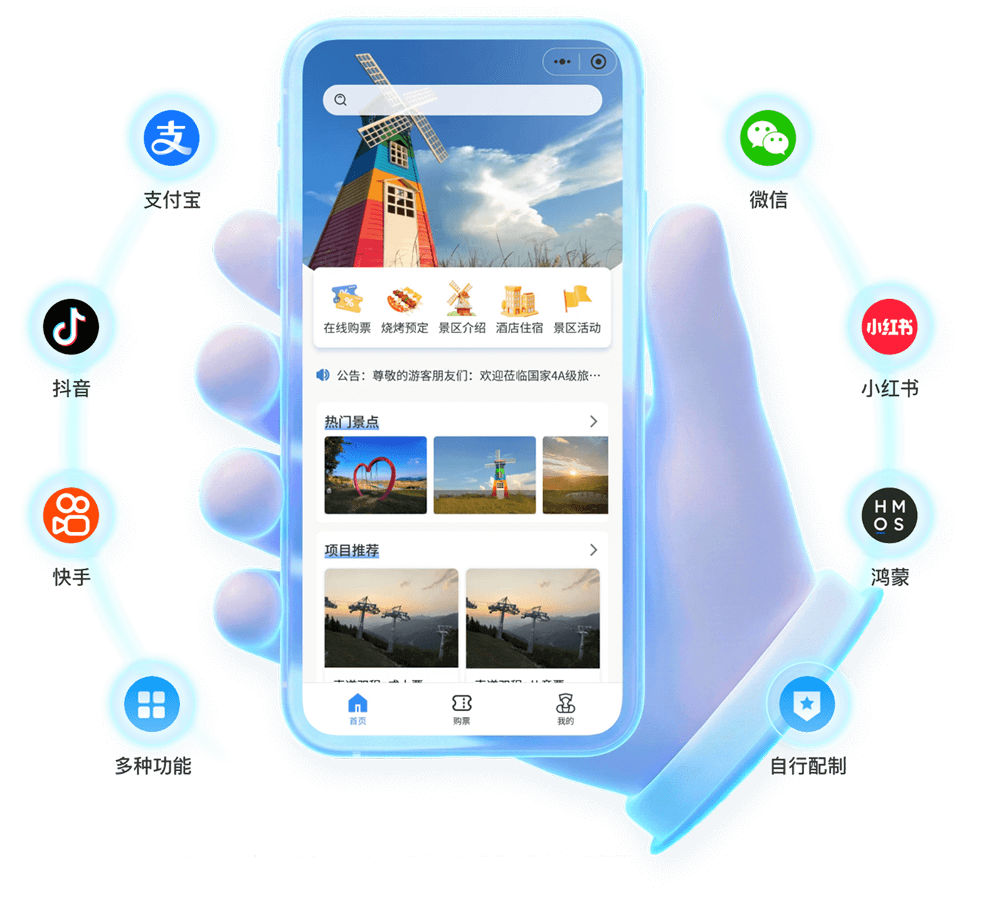 系统提供全面数据分析,并支持接入第三方OTA渠道,为景区运营决策和营销推广提供支持。一次部署,6端展示